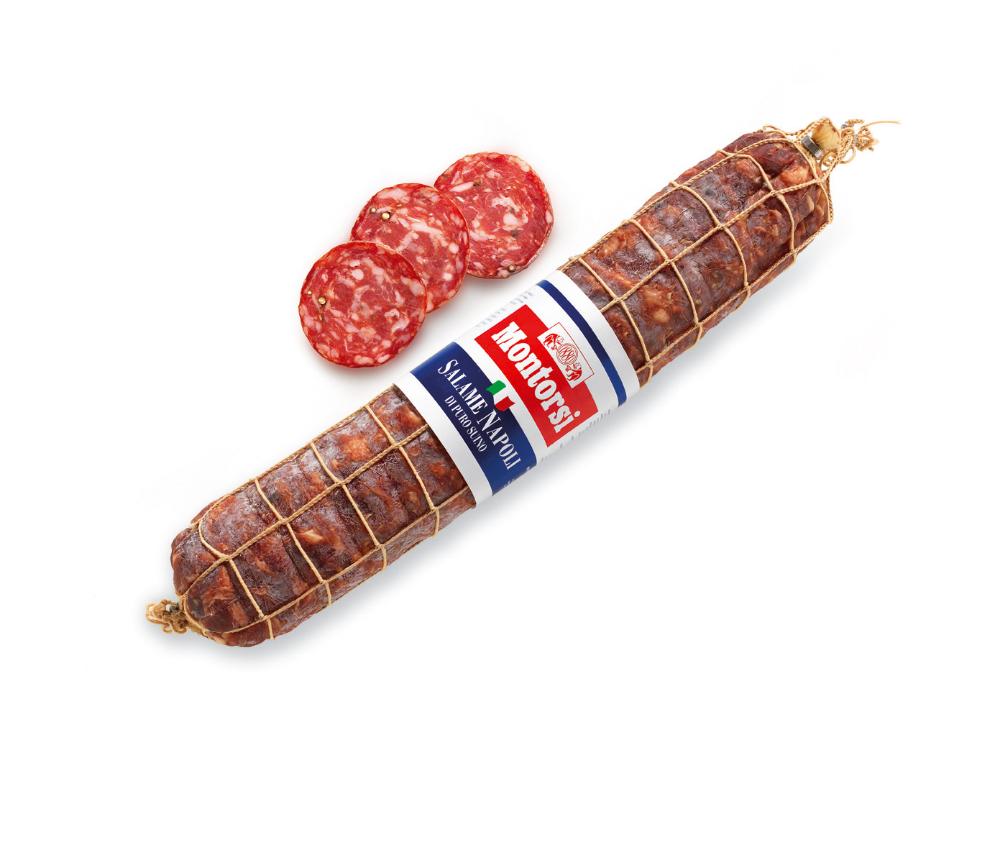 Napolitan medium/thick-cut air-cured salami, slightly spicy and smoked, in synthetic casing