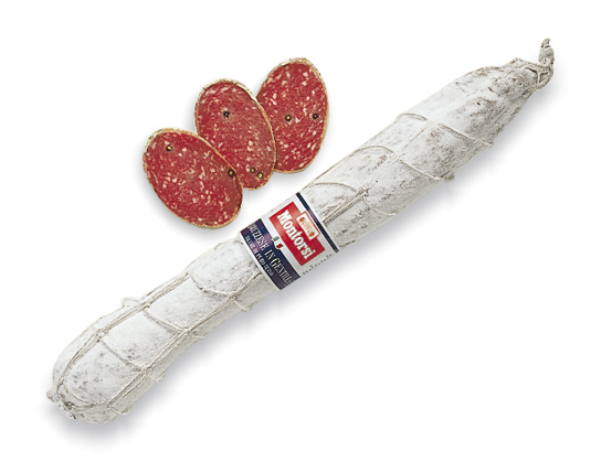 Salame stagionato a fette sottilissime, piccante, con peperoni neri interi, in budello naturale