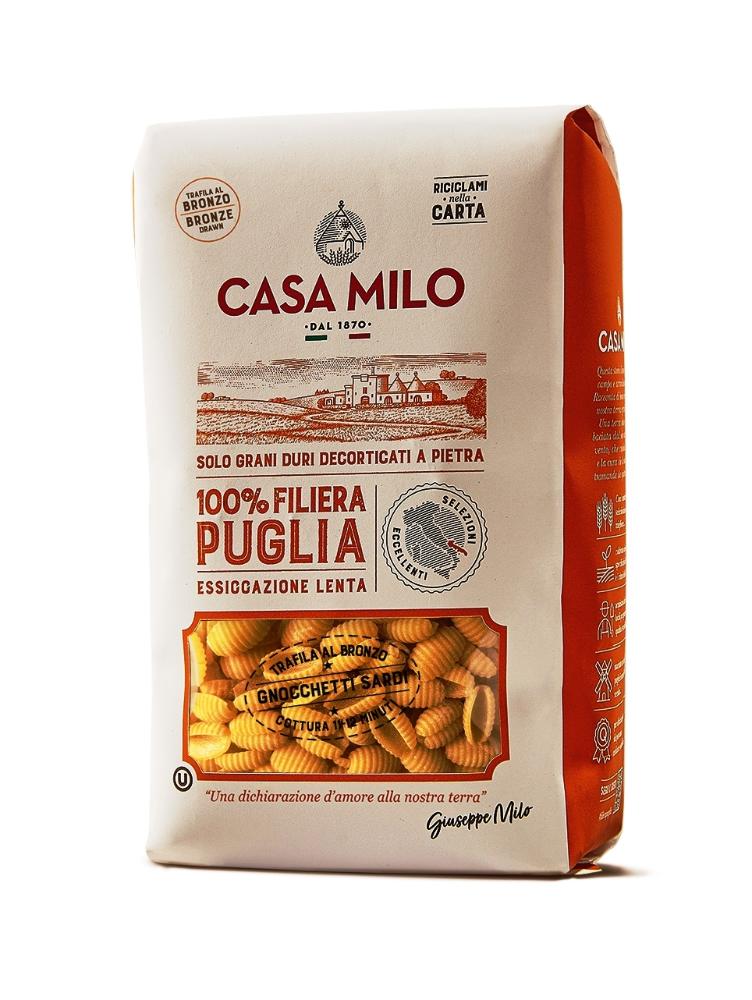 Εκλεκτά Gnocchetti Sardi φτιαγμένα από Ιταλικά σκληρά σιτάρια, σε μπρούτζινες μήτρες (trafilato al bronzo) και αργή διαδικασία ξήρανσης (lenta cottura)